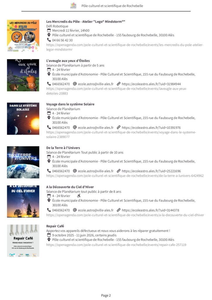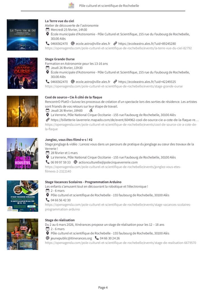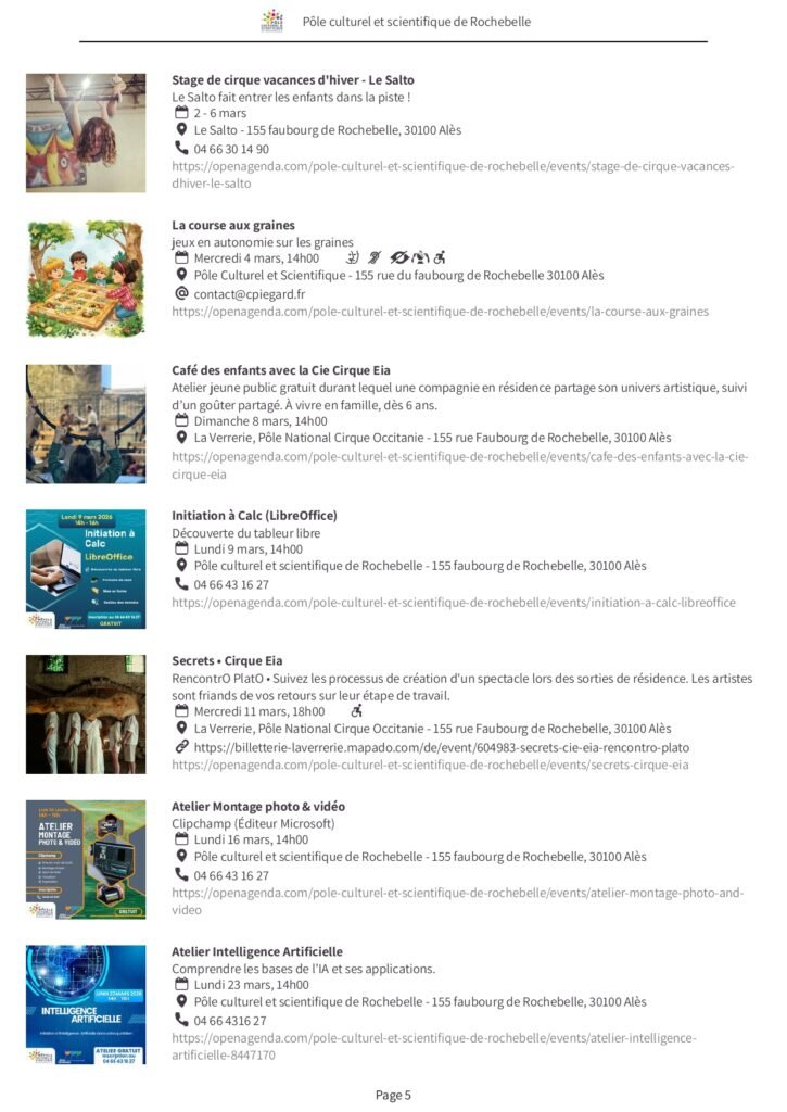 Agenda du pôle culturel et scientifique de Rochebelle février / mars 2026